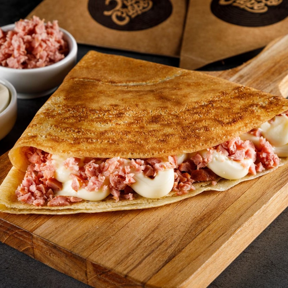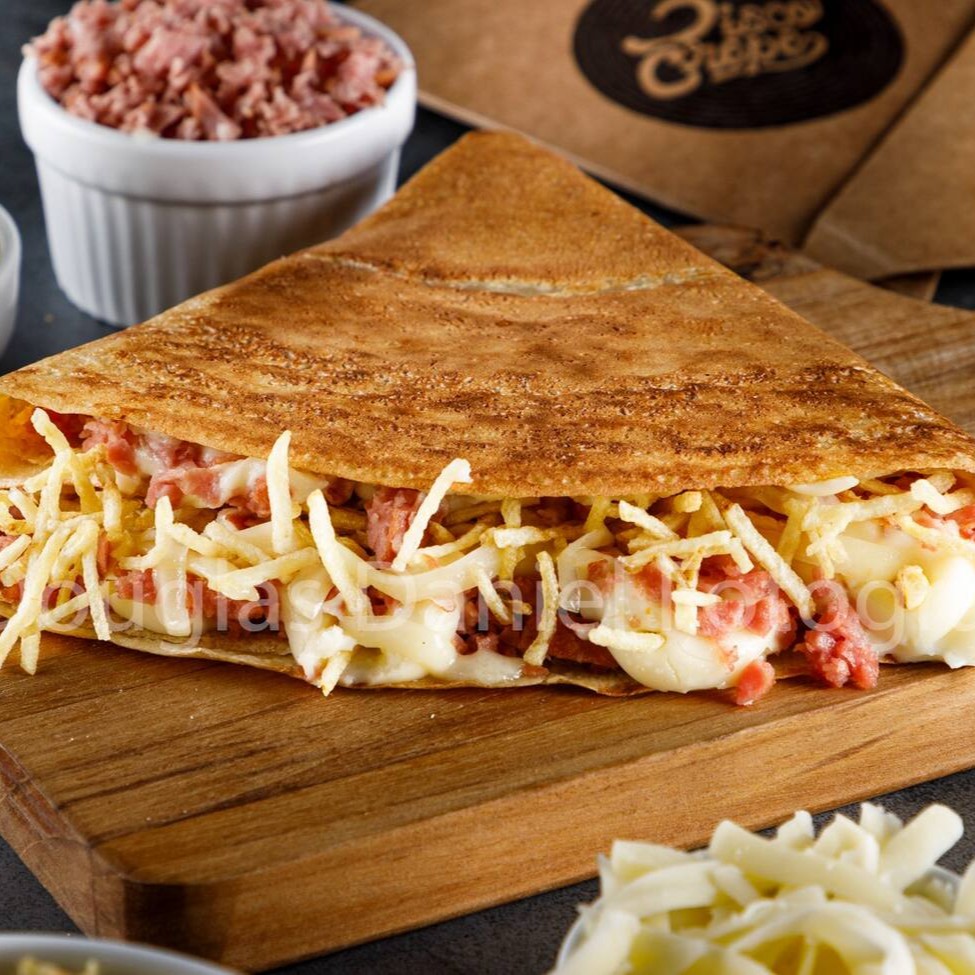O nome já diz tudo! Crepe com massa fininha, super recheado com calabresa defumada triturada, batata palha, muçarela derretida e requeijão cremoso (Tirolez).