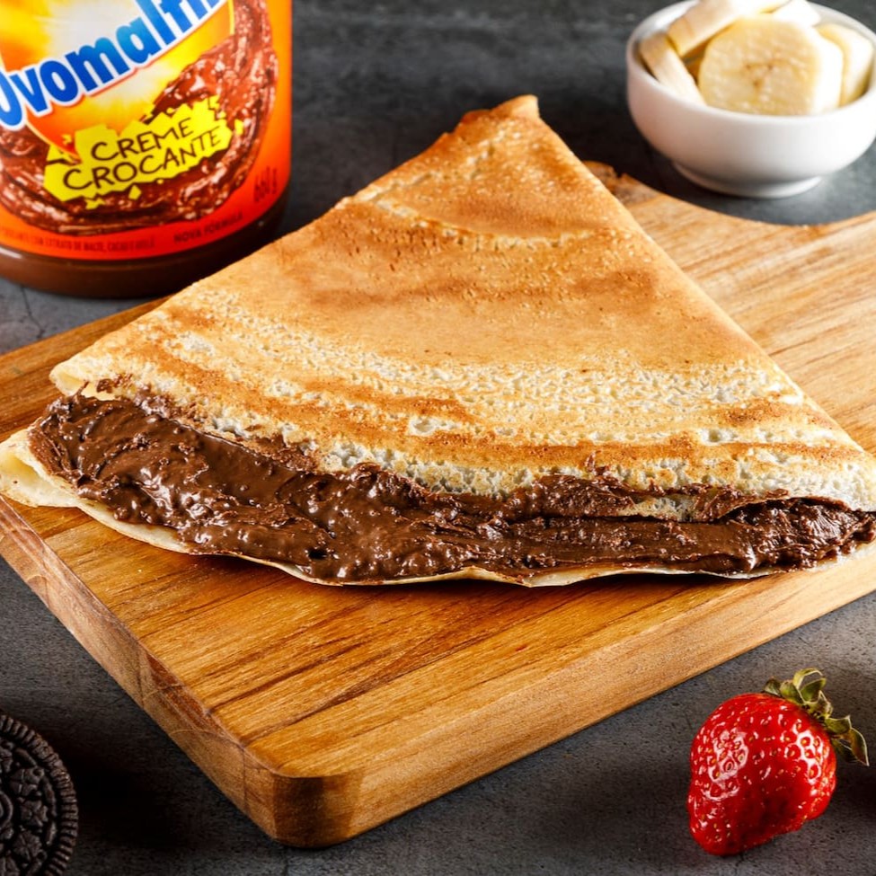 Crepe com massa fininha, recheado com creme de Ovomaltine (Original).