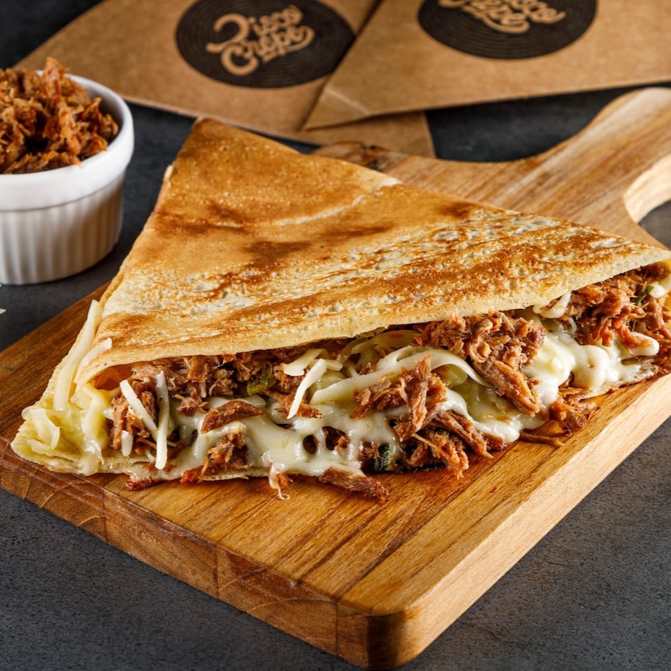 Crepe recheado com uma deliciosa carne desfiada (carne louca) e muçarela derretida.