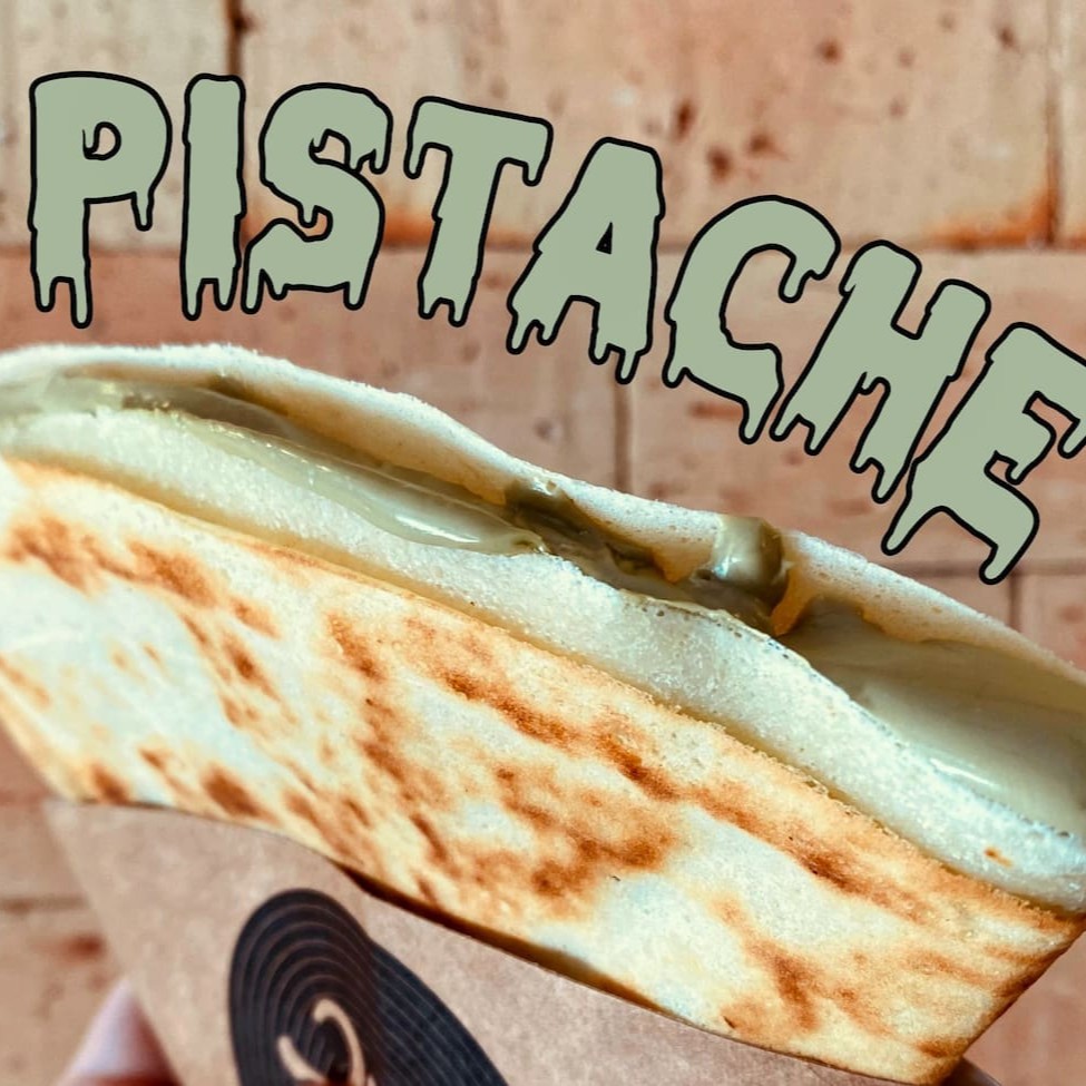 Crepe com massa fininha, recheado com um delicioso creme de Pistache. É Pistache de verdade :)