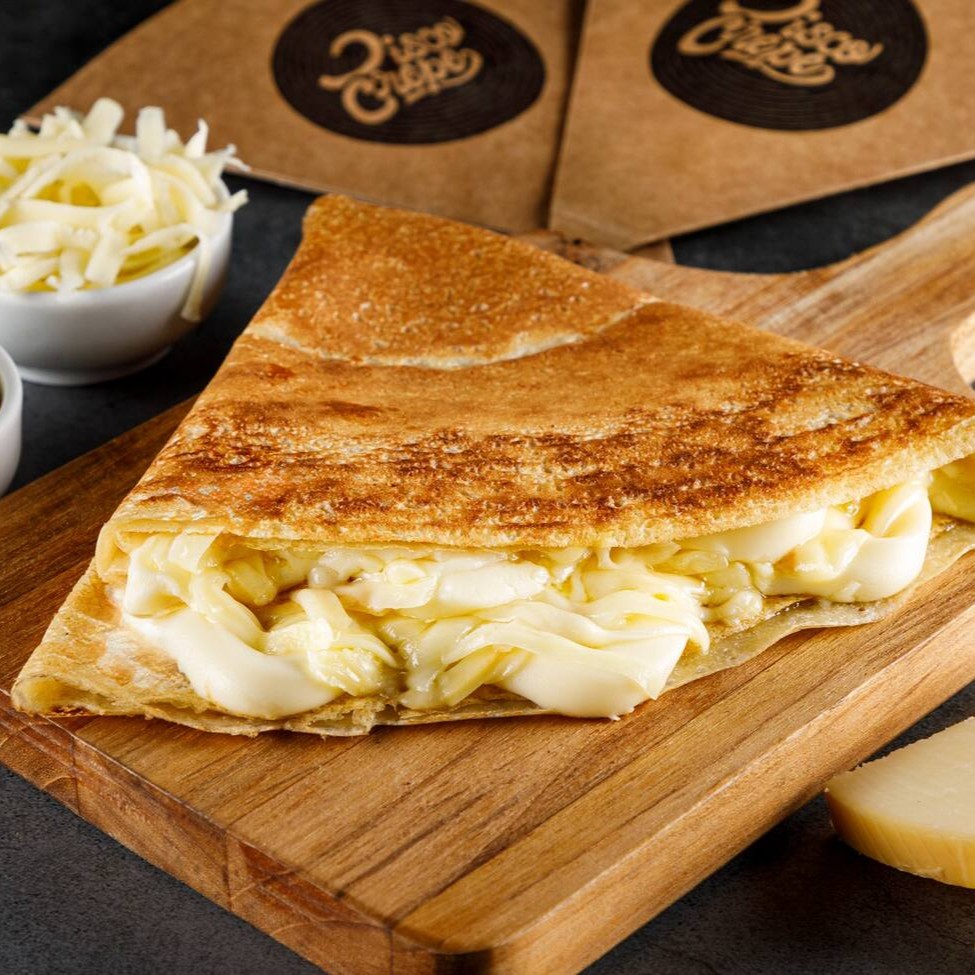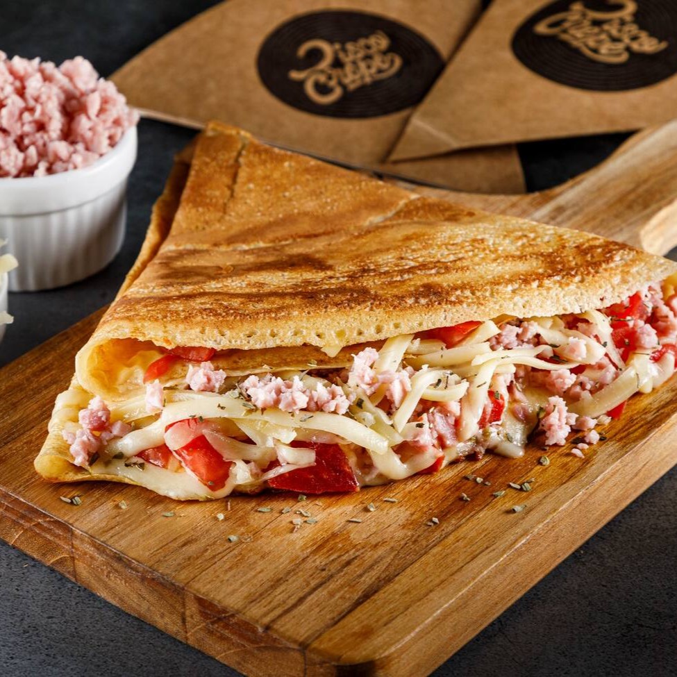 Crepe com massa fininha e super recheado com muçarela, provolone e requeijão cremoso (Tirolez).