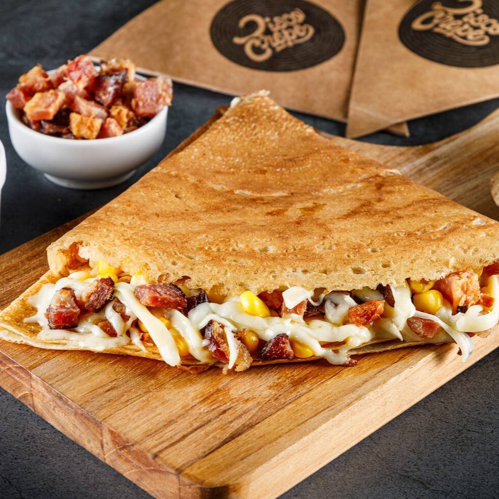 Crepe com massa fininha, recheado com bacon defumado em cubos, milho e muçarela.
