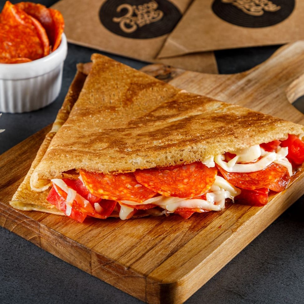 Crepe com massa fininha recheado com Pepperoni fatiado (Sadia), tomate fresco picado e muçarela