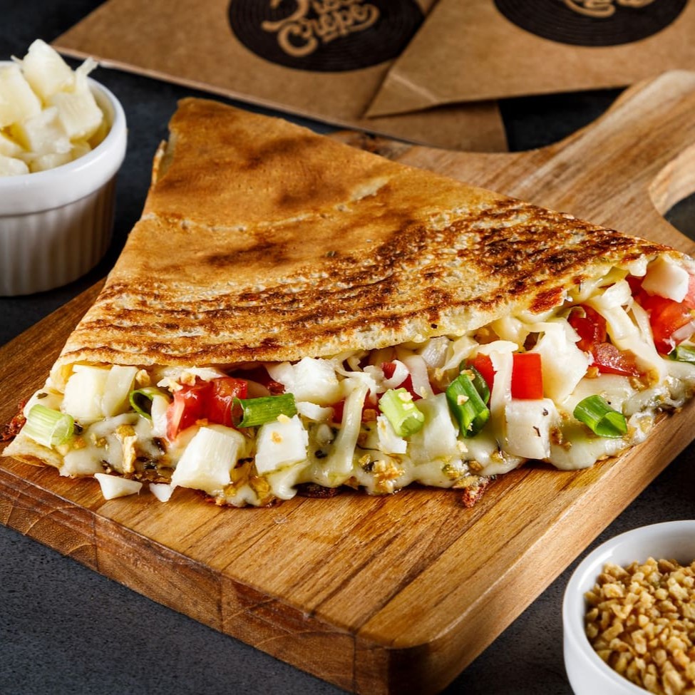 Crepe com massa fininha e super recheado com palmito pupunha picado, muçarela derretida, tomate fresco picado, cebolinha e alho frito.