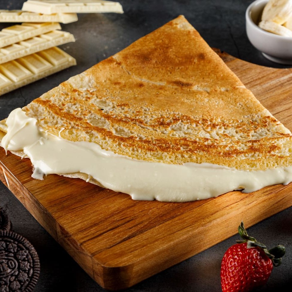 Crepe com massa fininha, recheado com um delicioso chocolate branco.