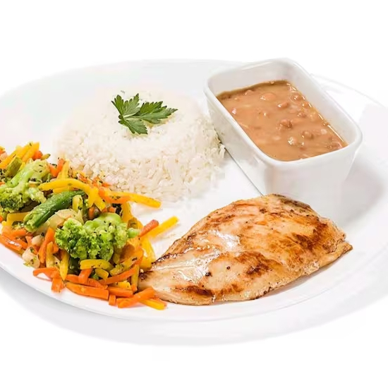 Um Saboroso Filé de frango Grelhado acompanhado de batata frita , arroz , feijão e salada.