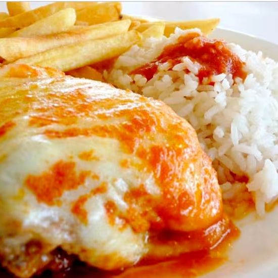 Um Delicioso Parmegiana de frango , bem suculento e acompanhado de batata frita , arroz , feijão e salada.