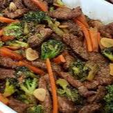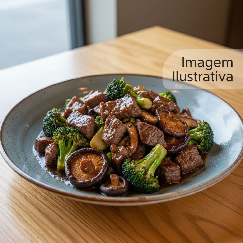 Pedaços de carne bovina fatiada com brócolis e champignon ao molho shoyu.