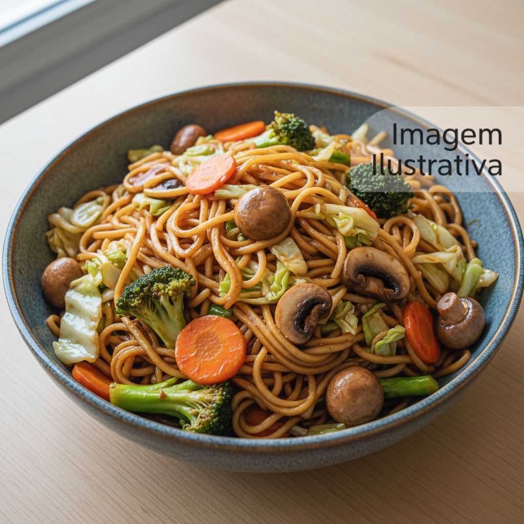 Macarrão chinês com legumes selecionados ao molho shoyu.