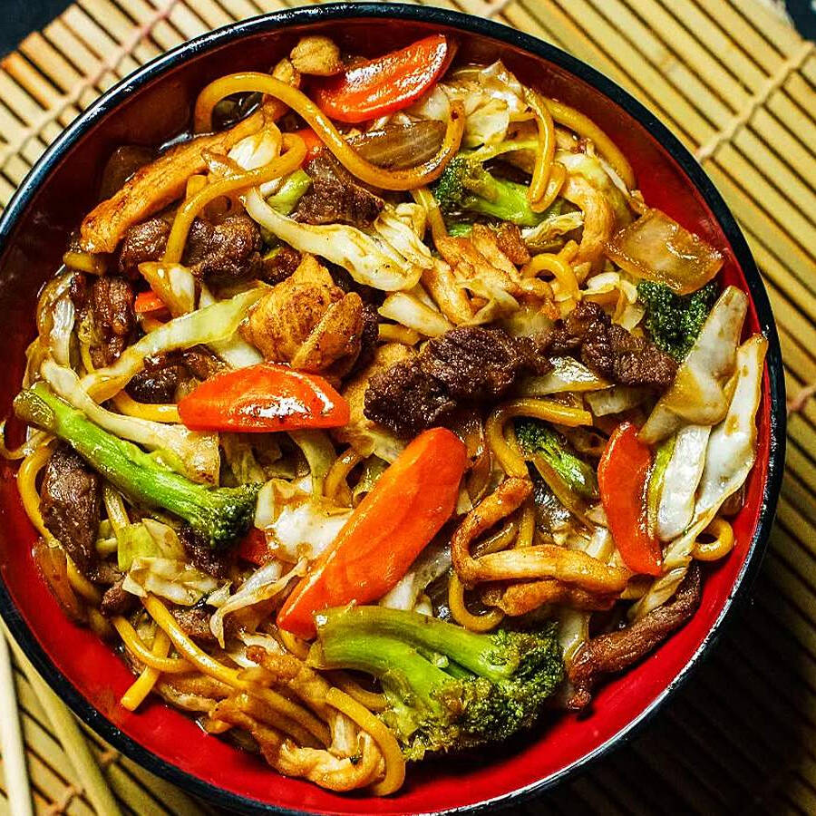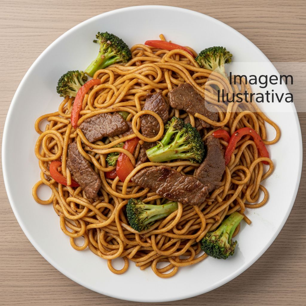 Macarrão frito com tiras de carne bovina, legumes frescos e molho shoyu especial .