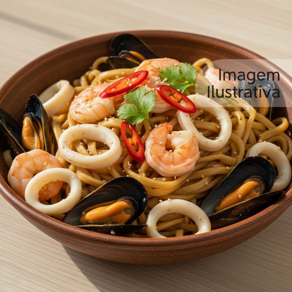 Macarrão chinês com camarão, lula e legumes selecionados ao molho shoyu.