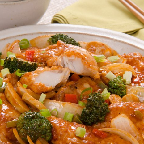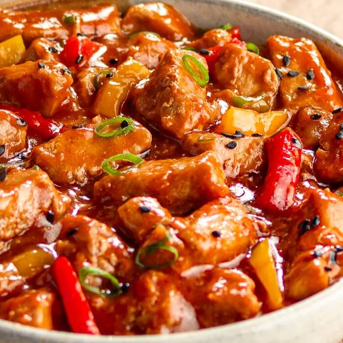 Peito de frango suculento com pimentões coloridos e cebola em um molho agridoce.