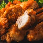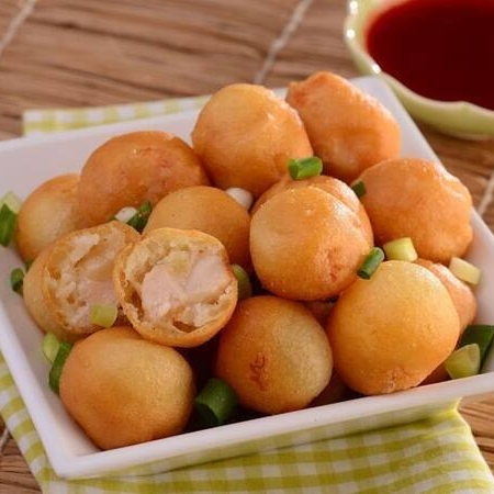 Pedaços de frango desossados e fritos, salpicados com cebolinha.