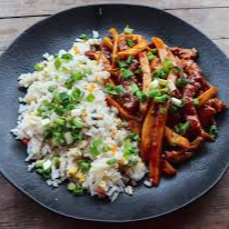 Cubs de peito de frango com pimentão e cebola ao molho shoyu. Acompanha Arroz Chop-Suey com arroz soltinho, flocos de ovo, cubinhos de cenoura e cebolinha.