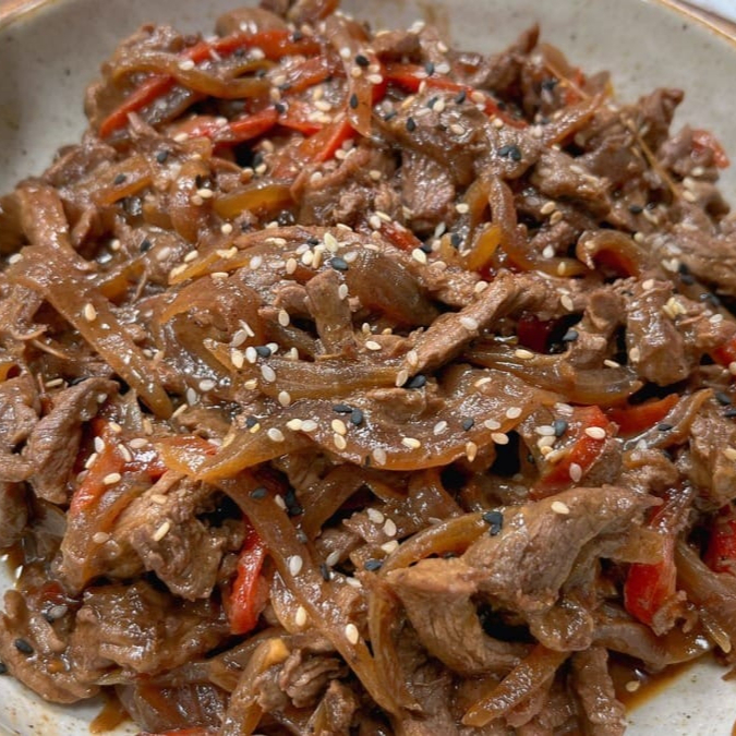Pedaços de carne bovina fatiada com Cebola ao molho shoyu
