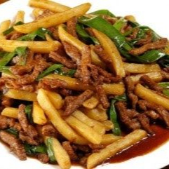 Pedaços de carne bovina fatiada com batata frita salpicada com cebolinha ao molho shoyu.
