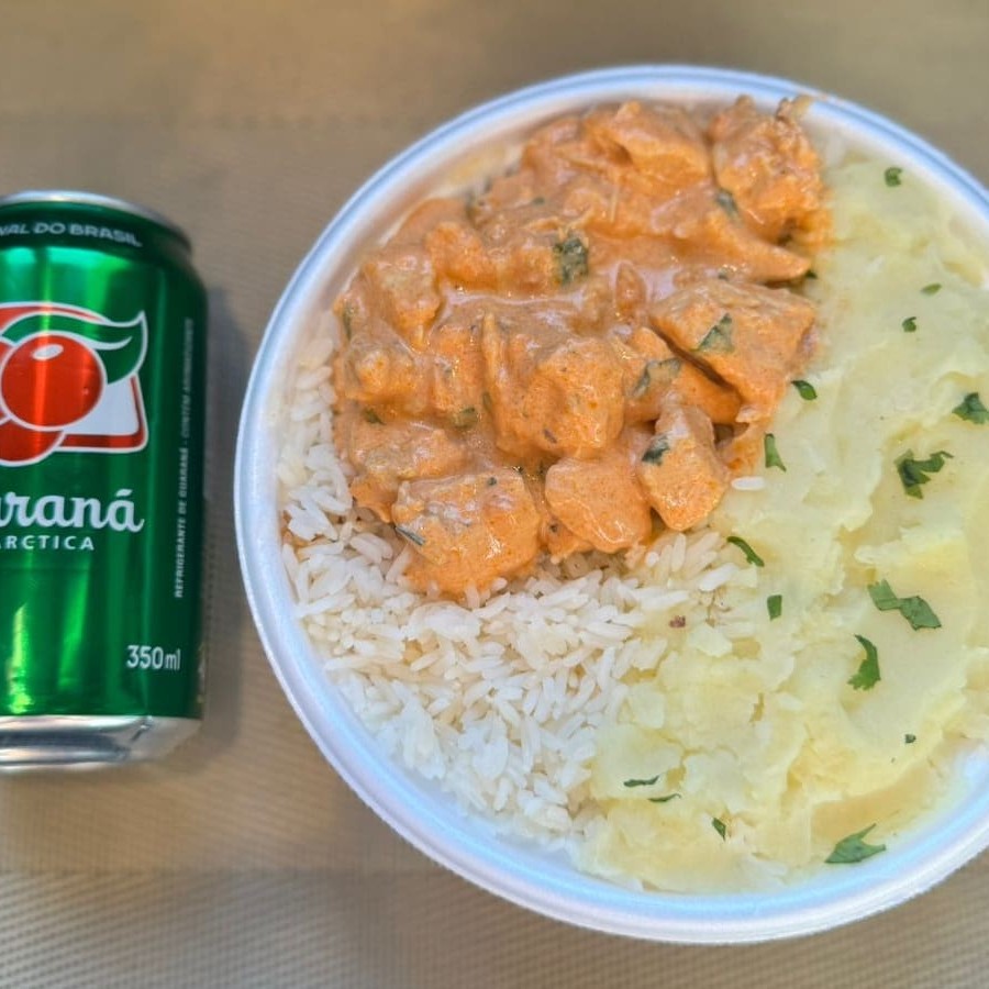 Marmita com delicioso filé de frango ao molho estrogonofe acompanhado de arroz branco e batatas fritas.. Acompanha refrigerante Coca Cola lata Zero sem açúcar 350ml bem gelada. Marmita indicada para 01 pessoa.
