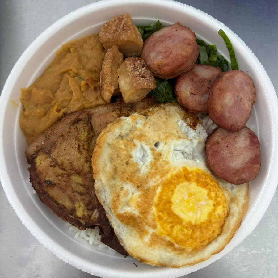 Arroz, tutu de feijao, ovo, toscana, bisteca, torresmo e couve.