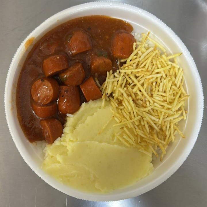 Salsicha ao molho, arroz, feijao, pure e batata palha.