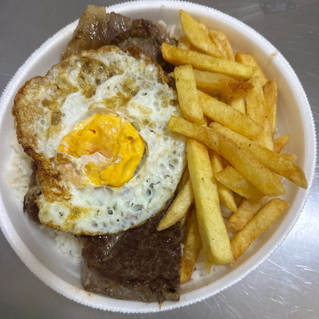 Bife, um ovo, arroz, feijao e fritas.