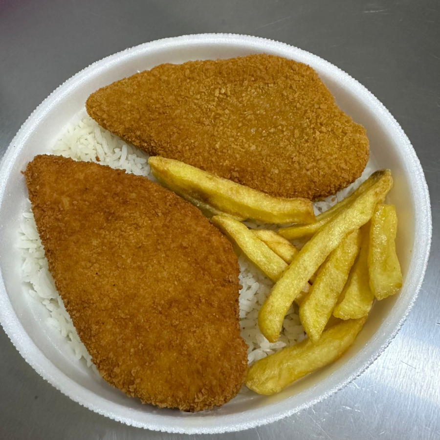 Dois steak de frango, arroz, feijao e fritas.