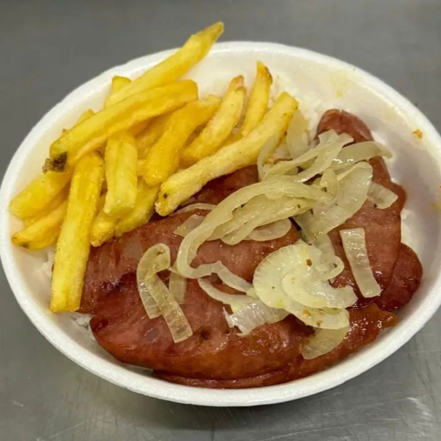 Calabresa, arroz, feijao e fritas.