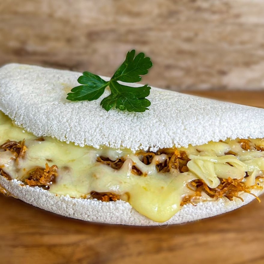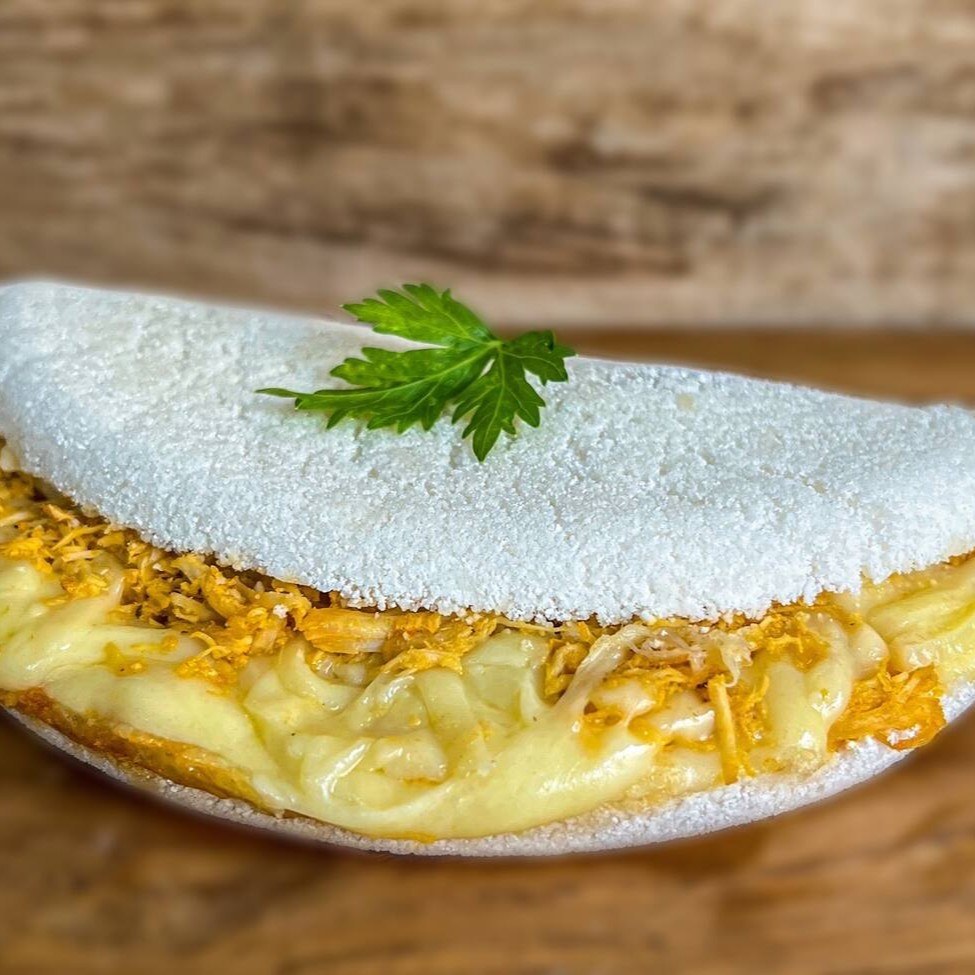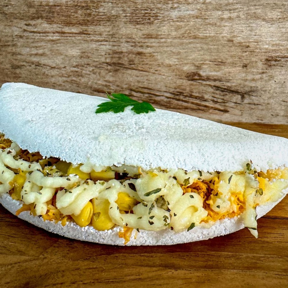 Nossa deliciosa massa de tapioca caseira totalmente natural e sem conservantes, acompanhada de 70g de frango desfiado, 65g de Catupiry de qualidade,10g de milho e uma pitada generosa de orégano!