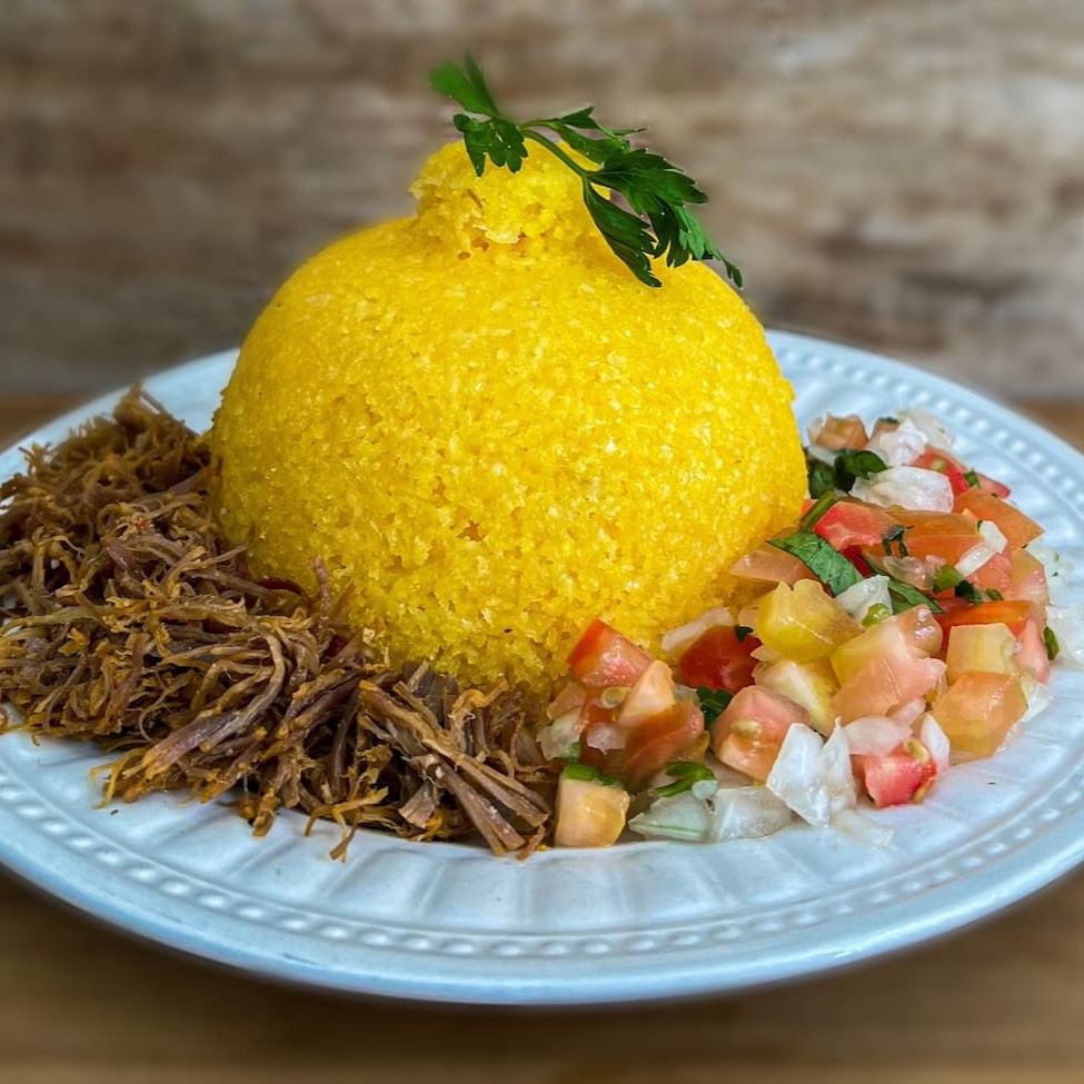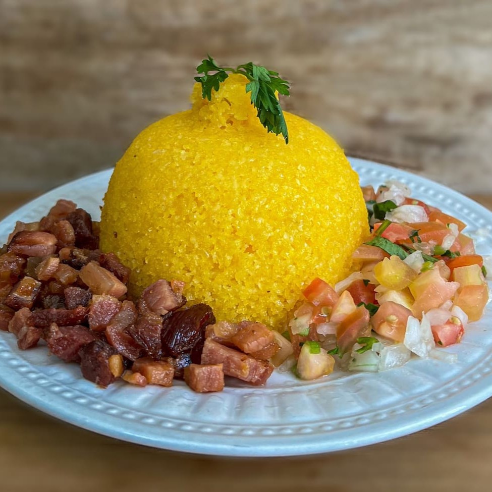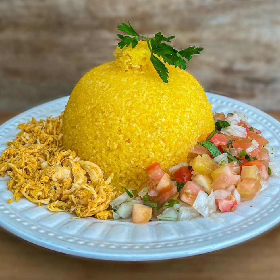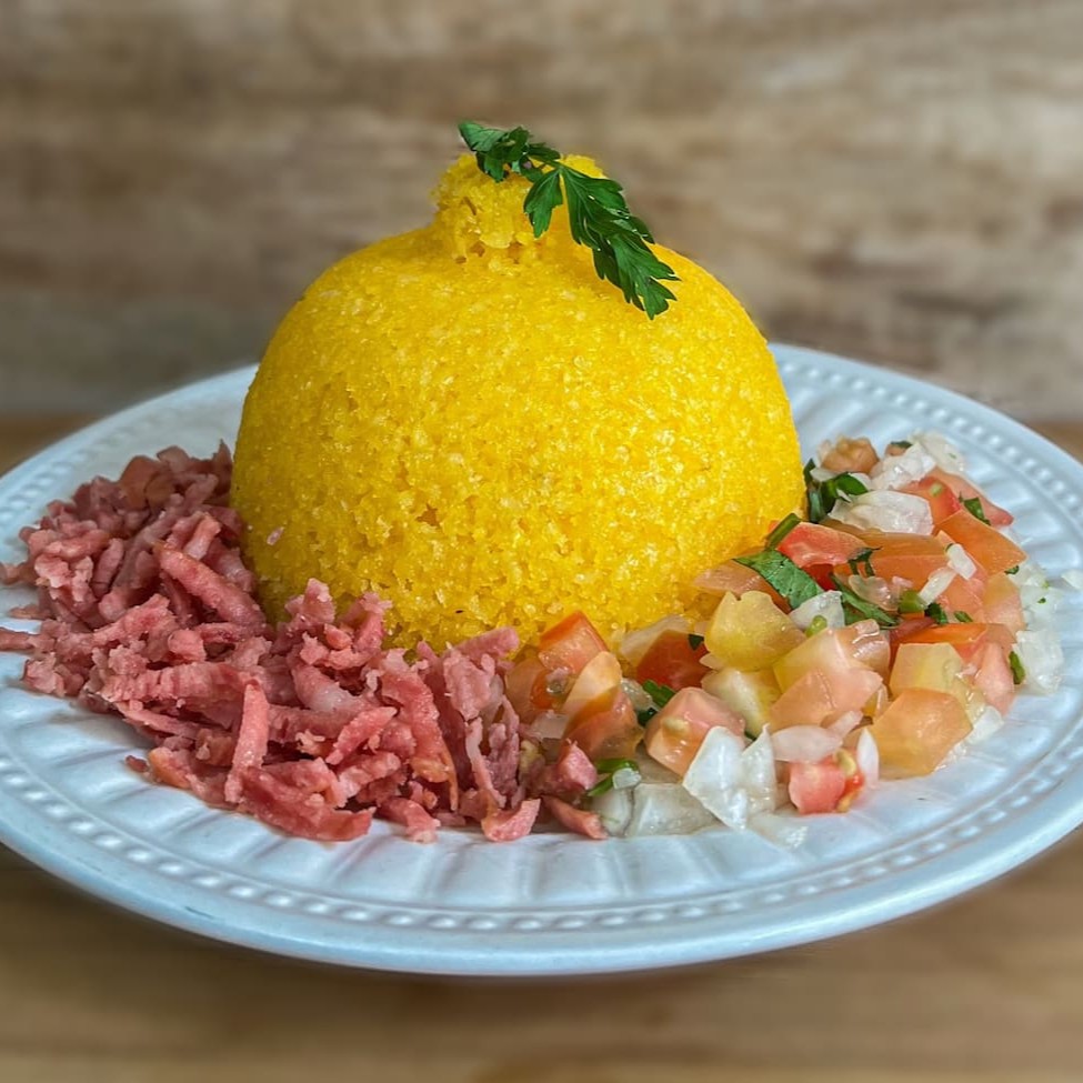 Nosso saboroso cuscuz fofinho recheado com 40g da nossa carne seca artesanal, *acompanhado de um potinho de vinagrete da casa*