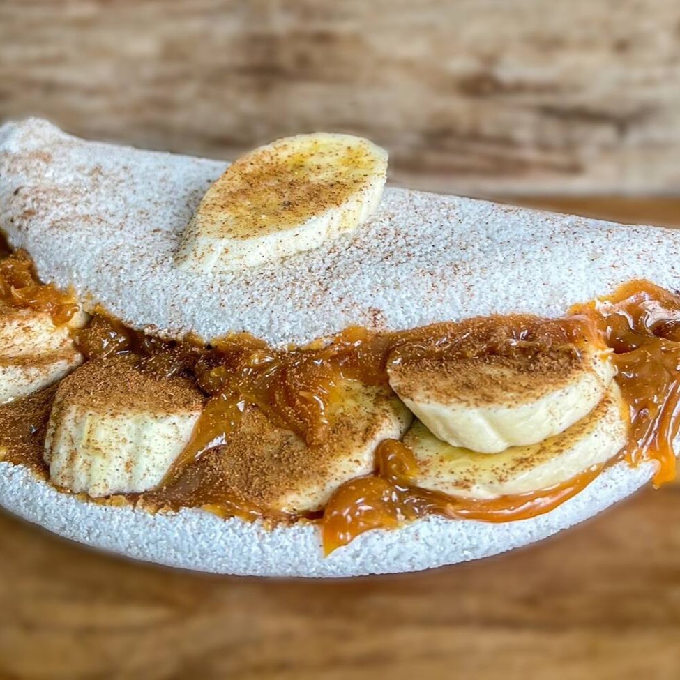 Nossa deliciosa massa de tapioca caseira totalmente natural e sem conservantes, acompanhada de 50g de doce de leite cremoso e banana.