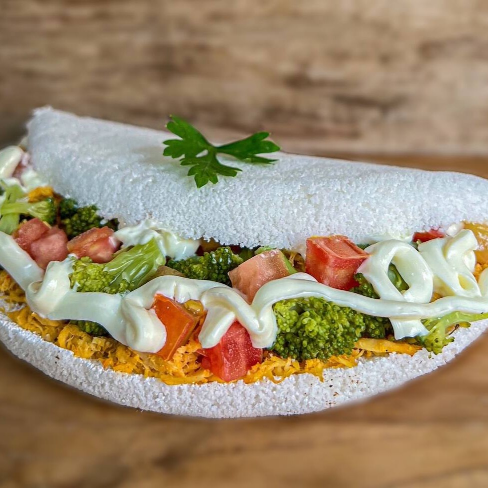 Nossa deliciosa massa de tapioca caseira totalmente natural e sem conservantes, acompanhada de 50g de frango, tomate, brócolis e cream cheese.