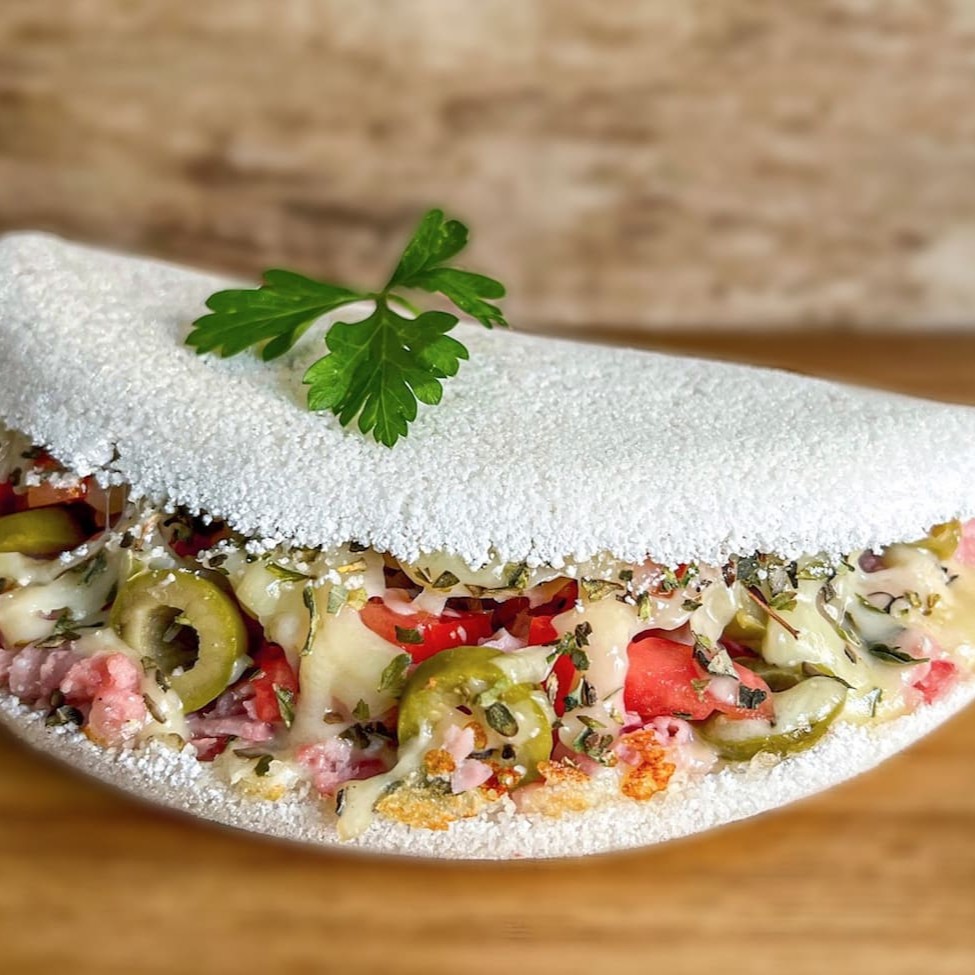 Nossa deliciosa massa de tapioca caseira totalmente natural e sem conservantes, acompanhada de 50g de calabresa, ovos mexidos e 50g de queijo mussarela.