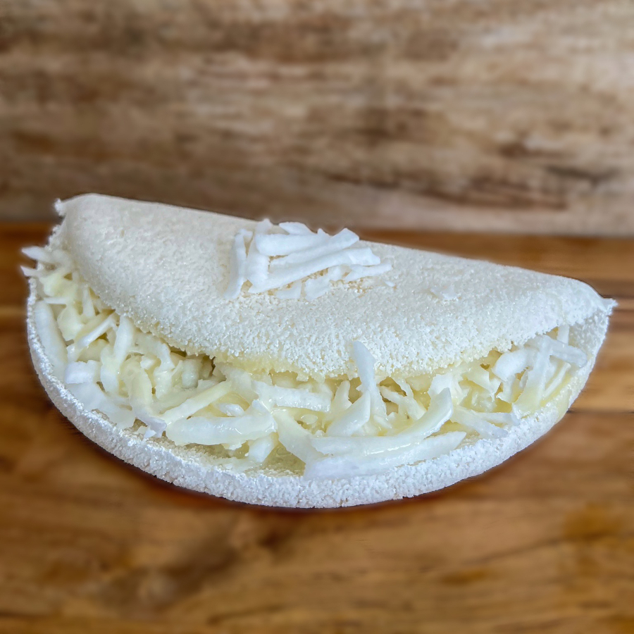 Nossa deliciosa massa de tapioca caseira e totalmente natural e sem conservantes, acompanhada de 70g de frango desfiado e 70g de queijo mussarela.