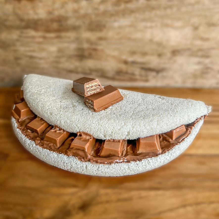 Nossa deliciosa massa de tapioca caseira totalmente natural e sem conservantes, acompanhada de 70g de um saboroso creme de avelã e chocolate Kit Kat!