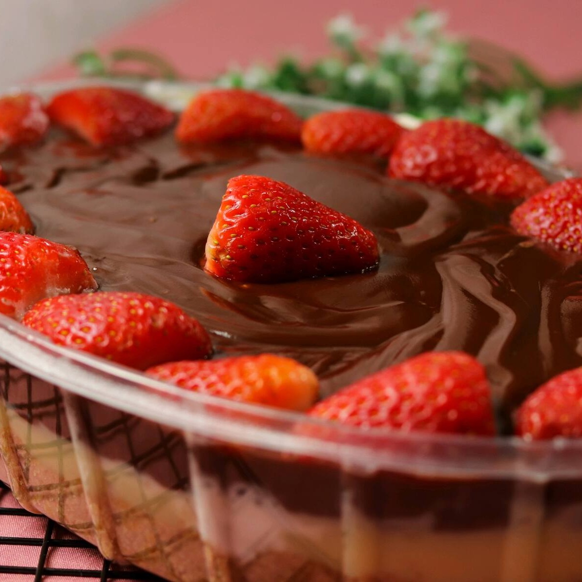 Deliciosa torta Bombom de morango feita uma uma incrível camada de biscoitos Maizena cobertos por um maravilhoso creme de baunilha e com um ganache que dá água na boca, finalizada com pedaços especiais de morango.