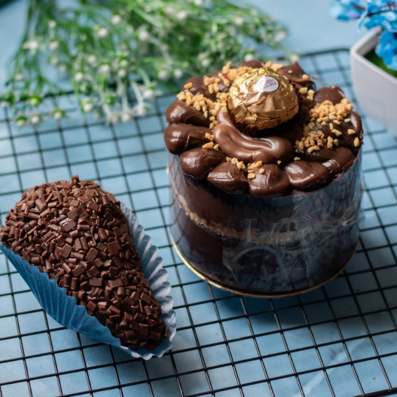 Uma sobremesa feita para impressionar! Nosso brownie denso e molhadinho ganha um toque de luxo com pedaços de Ferrero Rocher e uma generosa cobertura de Nutella cremosa. A combinação perfeita entre o chocolate intenso, o crocante das avelãs e a suavidade do creme de avelã transforma cada mordida em uma experiência única e inesquecível. Pura indulgência, puro prazer. Se você ama chocolate, essa é