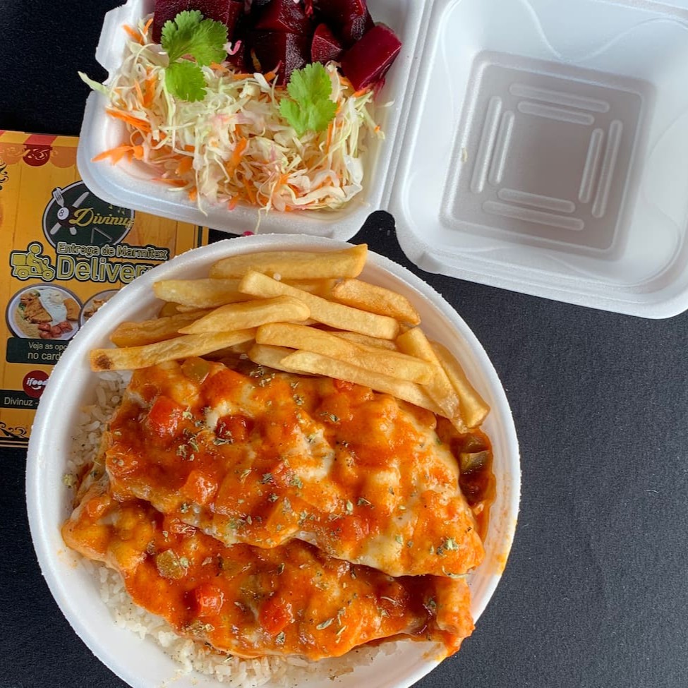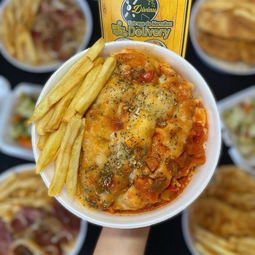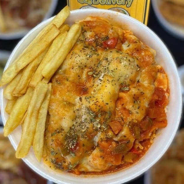 Parmegiana de frango com arroz soltinho, feijão e batata frita ou macarrão alho e óleo : Frango com queijo Frango com molho Molho com pimentão colorido Tomate Frango Orégano : RECIPIENTE DE 750ML
