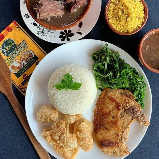 Feijoada no fogão a lenha ,bisteca , arroz , couve , torresmo , farofa , molho de pimenta. ( vai tudo em uma marmitex , menos a farofa e molho de pimenta )