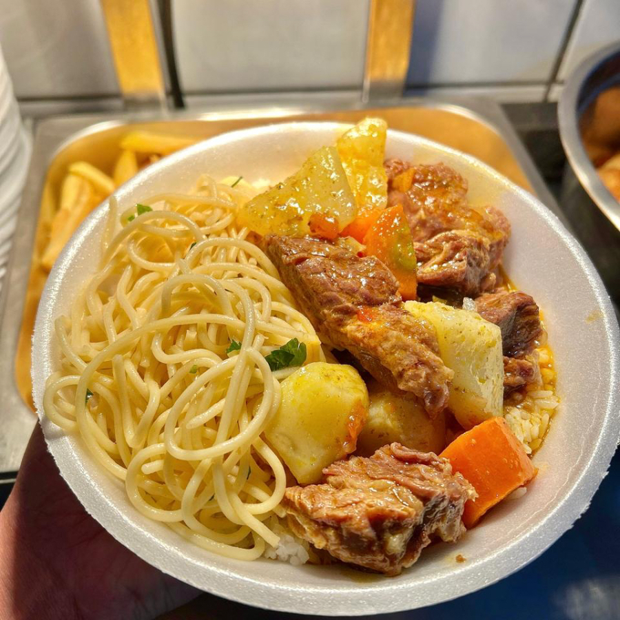 Arroz, feijão, carne cozida com batata , cenoura ,macarrão alho e óleo e salada do Dia Picadinho Carne cozida Carne com legumes Cenoura e batata cozida