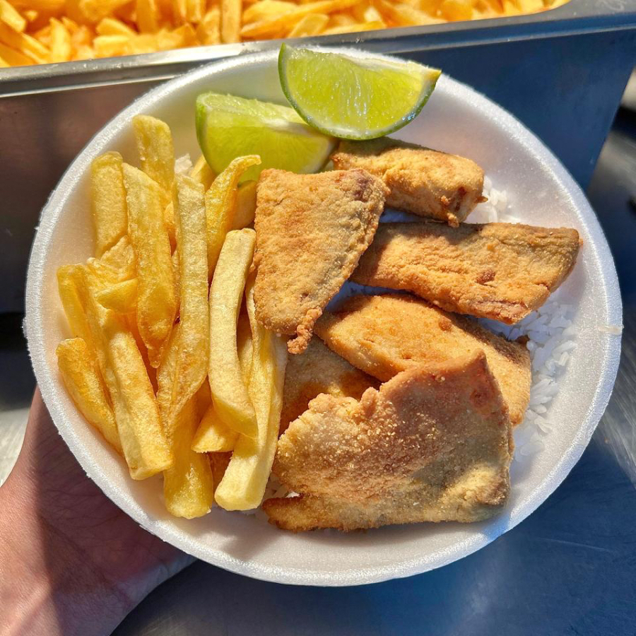 Arroz soltinho com feijão fresquinho um delicioso filé de merluza e um limão, de acompanhamento batata frita e macarrão alho e óleo E salada do Dia Filé de merluza Merluza frita Peixe merluza