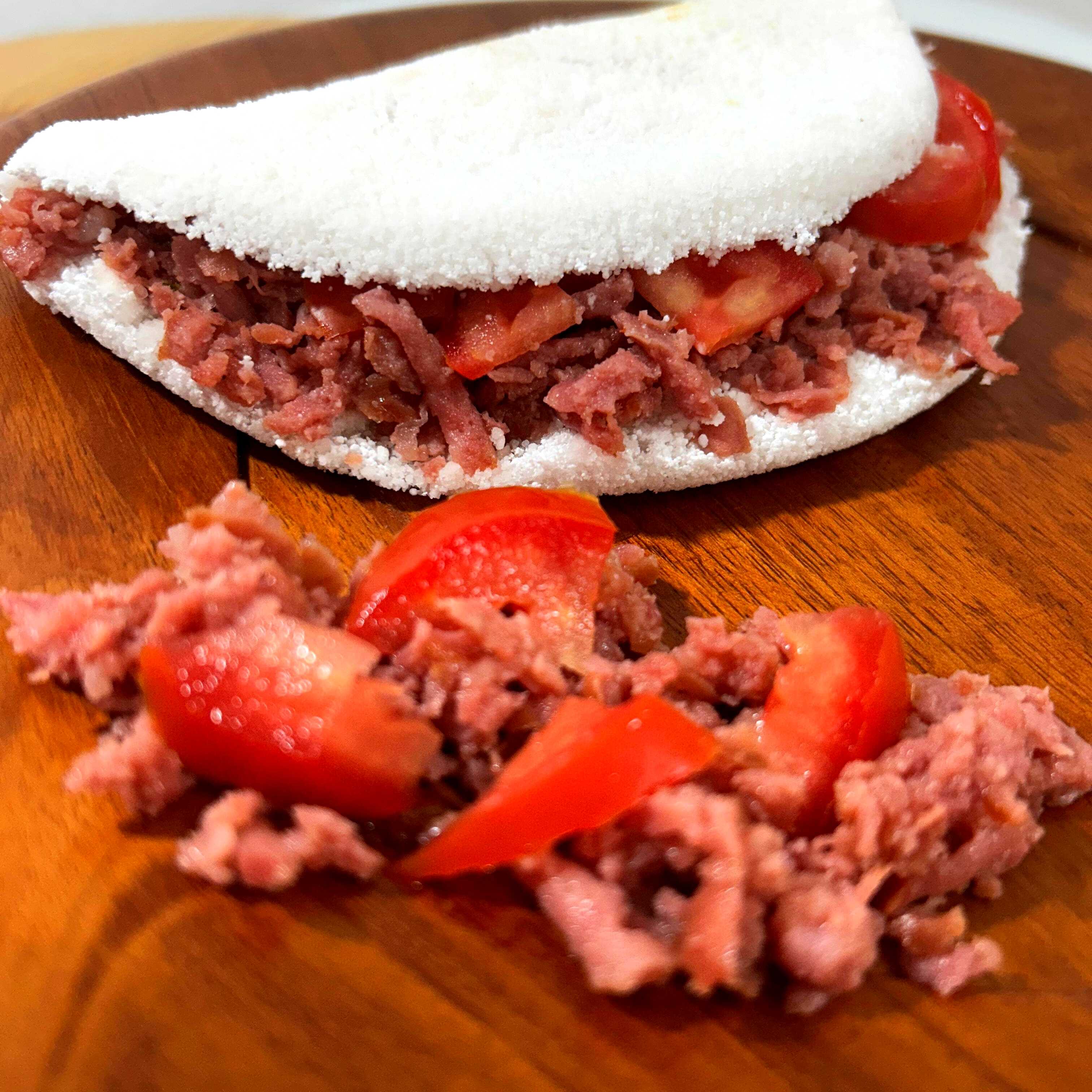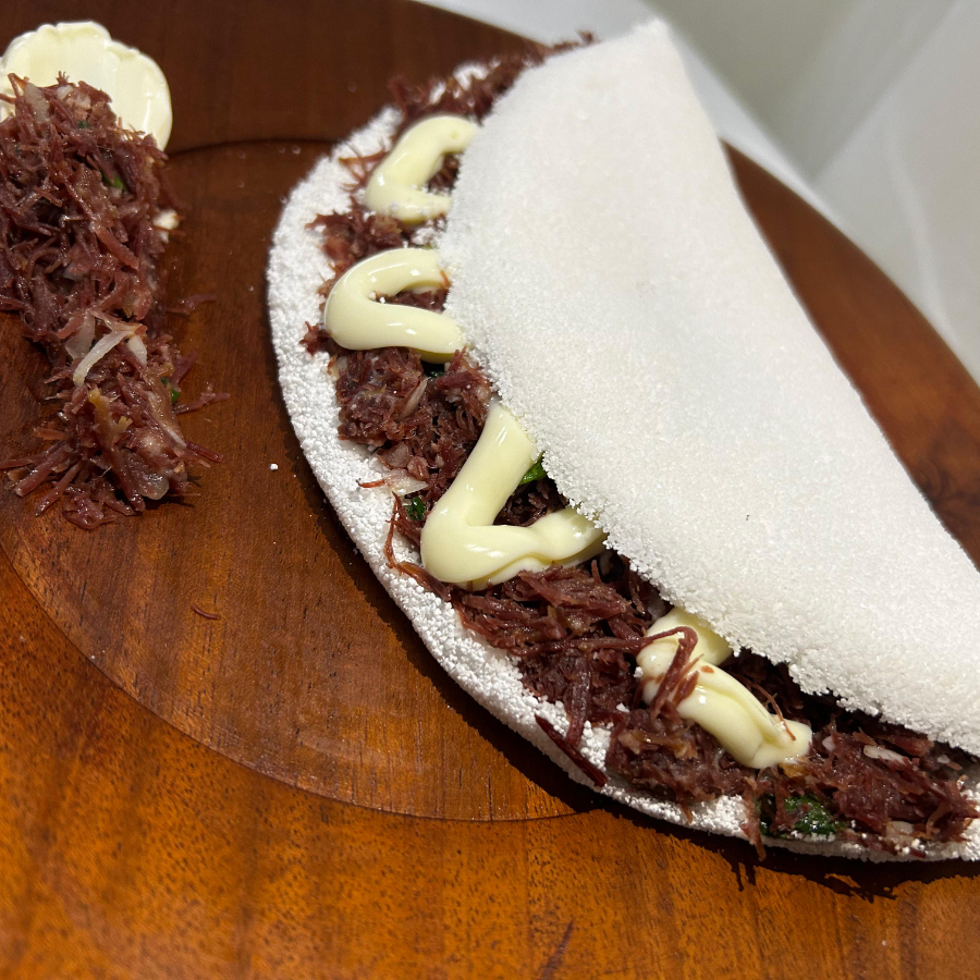 Massa de tapioca com carne seca, cebola roxa, requeijão - temperos sal, orégano e manteiga de garrafa