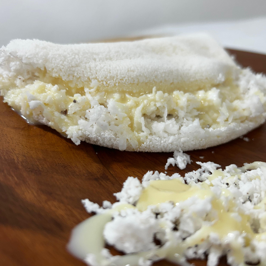 Massa de tapioca com coco ralado fresco, queijo mussarela ralado