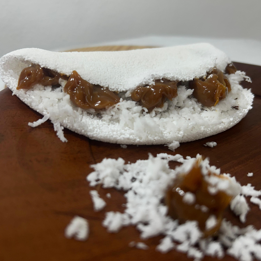 Massa de tapioca com doce de leite com coco ralado fresco