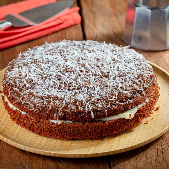 A mistura do coco que leva chocolate branco e uma massa amanteigada, enchem os olhos e a boca de tanta vontade de dar aquela primeira mordida, um ganache por cima de chocolate meio amargo dando aquele equilíbrio de sabor. Das maravilhosas receitas da rosa, este bolo ganha uma página especial, é tão gostoso quanto colo de mãe, um convite especial ao que faz bem ao coração. 600 grs