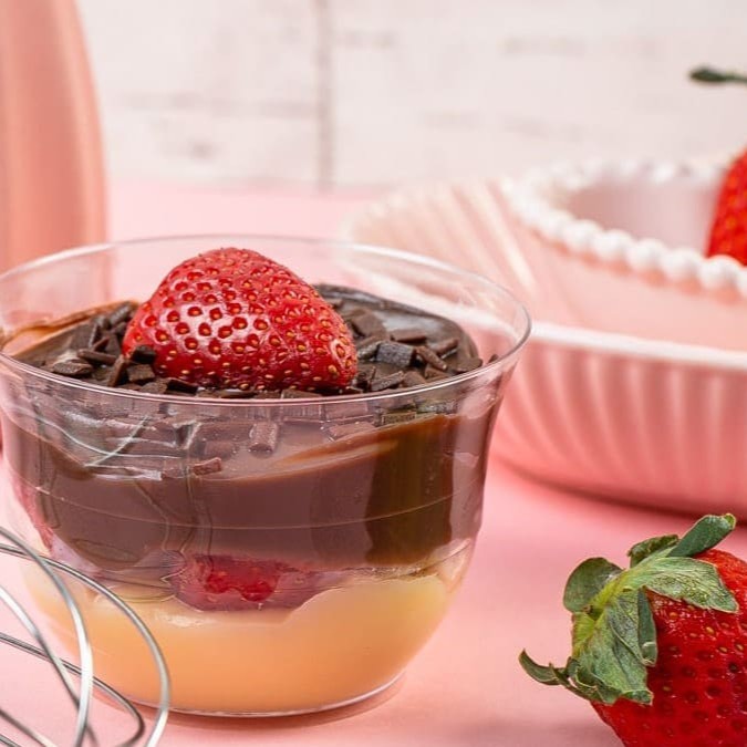 Uma camada especial do nosso leite Ninho, onde usamos leite condensado, uma camada de chocolate e pedaços de morango finalizando