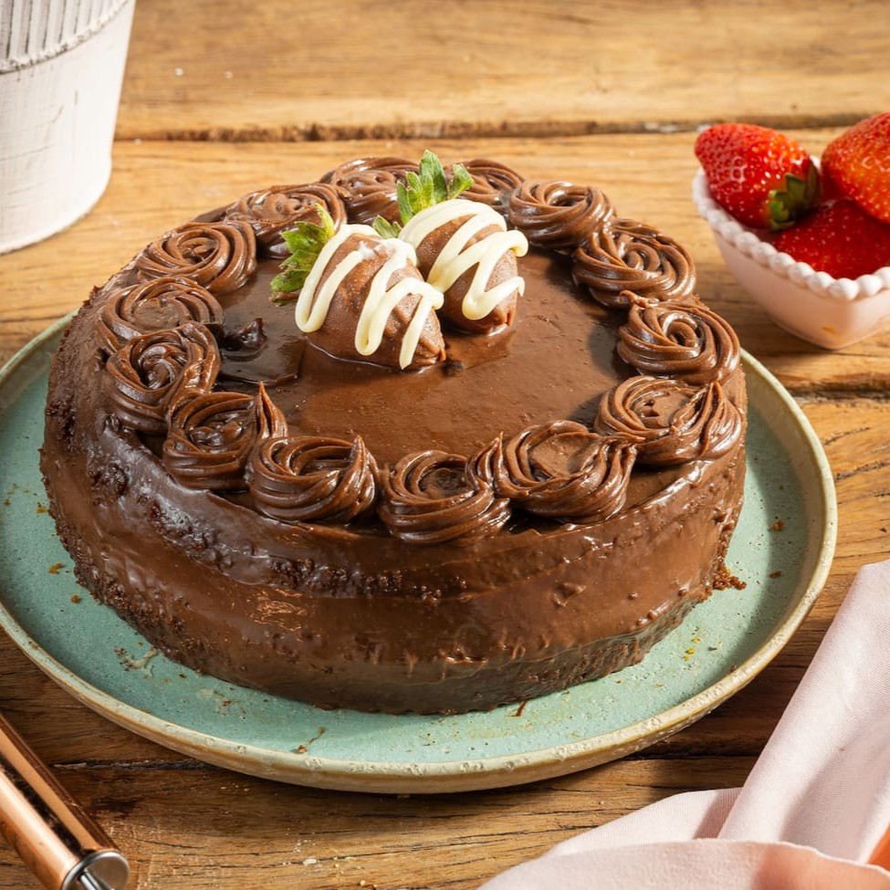 Um bombom em formato de bolo — feito pra surpreender em cada pedaço! Recheado com creme de leite Ninho bem suave, pedaços de morango fresco e uma cobertura generosa de brigadeiro caseiro. Finalizamos com morangos banhados no chocolate, trazendo aquele toque especial que encanta só de olhar.