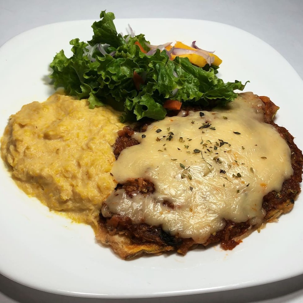 Abobrinha empanada com molho de tomate fresco, acompanha creme de milho e salada de alface, rúcula, manga, cenoura cozida e cebola roxa.