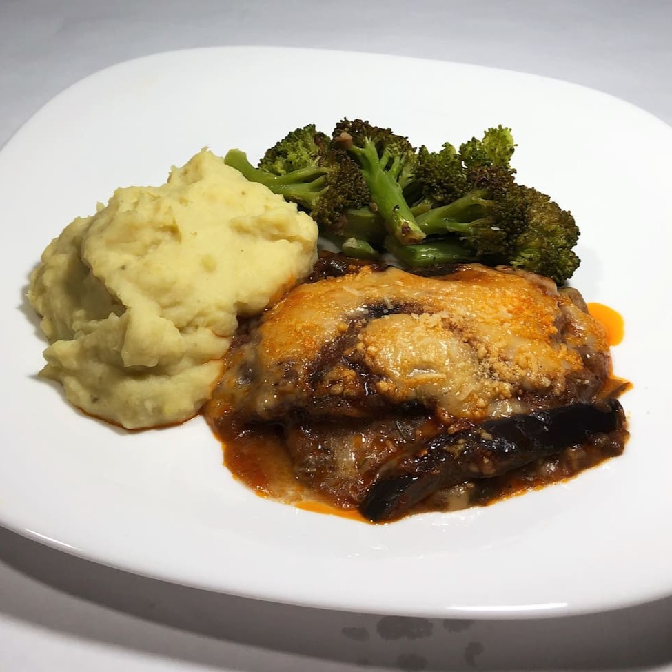 Berinjela montada com molho de tomate fresco e queijo, acompanha purê de batata doce e brócolis no regado de azeite e alho.