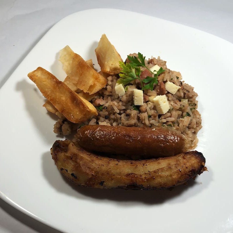 Conjunto de feijão fradinho com arroz branco, manteiga de garrafa, queijo coalho e especiarias da chef, acompanha linguiça vegana na chapa, mandioca frita e banana empanada frita.
