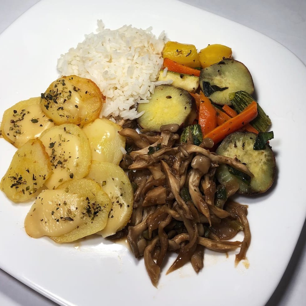 Batata assada com queijo, orégano e alecrim, acompanha arroz branco, shimeji na manteiga e salada de legumes cozido.