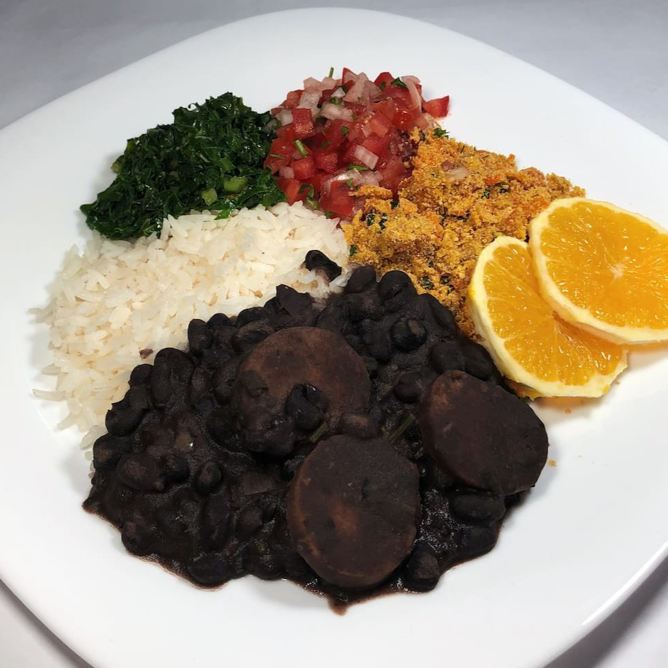 Feijão preto com linguiça vegana em rodela, acompanha arroz branco, couve refogada no alho, farofa de banana e cenoura, vinagrete e para finalizar aquela rodela de laranja.
